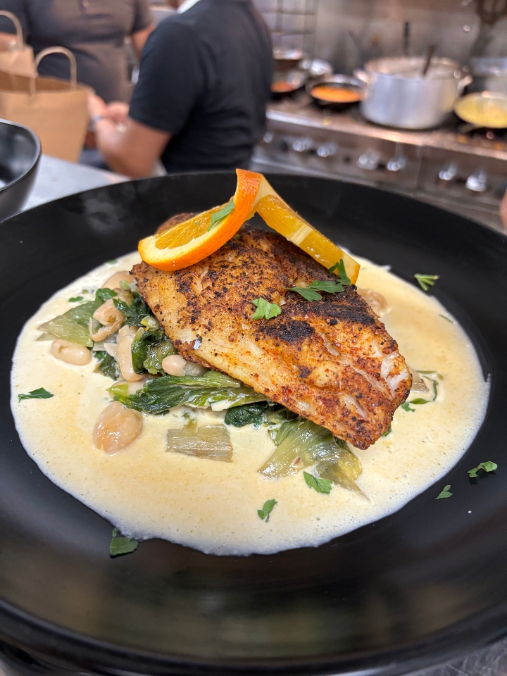 Lightly Cajun–dusted red snapper served over escarole and white beans in a lobster-infused cream sauce
