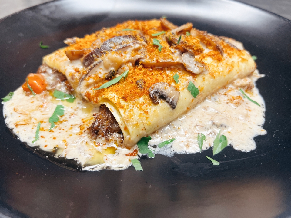Pasta sheets filled with our barolo braised short ribs baked with a toasted breadcrumb, truffle cream sauce and wild mushrooms